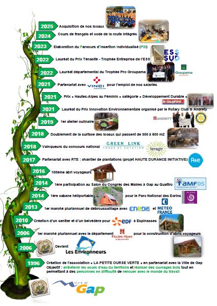 L’association (loi 1901) « LES ENVIRONNEURS » créée en 1996 à Gap dans les Hautes- Alpes (05) est un opérateur de l’emploi. C’est grâce à des chantiers de valorisation de l’environnement et de constructions bois que la structure atteint et dépasse chaque année ses objectifs d’insertion.